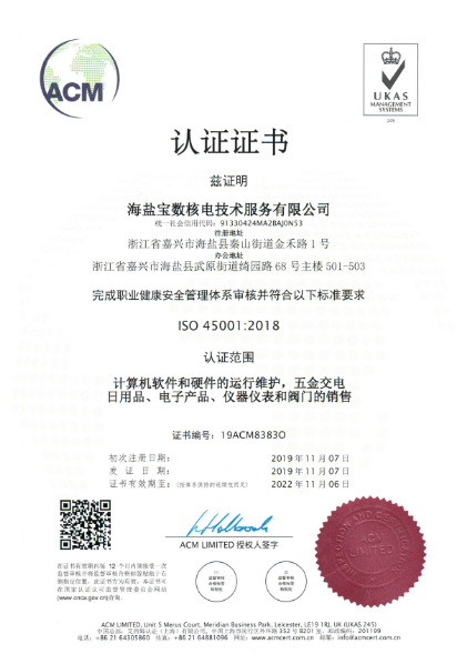 2019年11月07日海鹽寶數(shù)核電技術(shù)服務(wù)有限公司取得ISO9001認(rèn)證、ISO14001認(rèn)證ISO45001認(rèn)證證書。